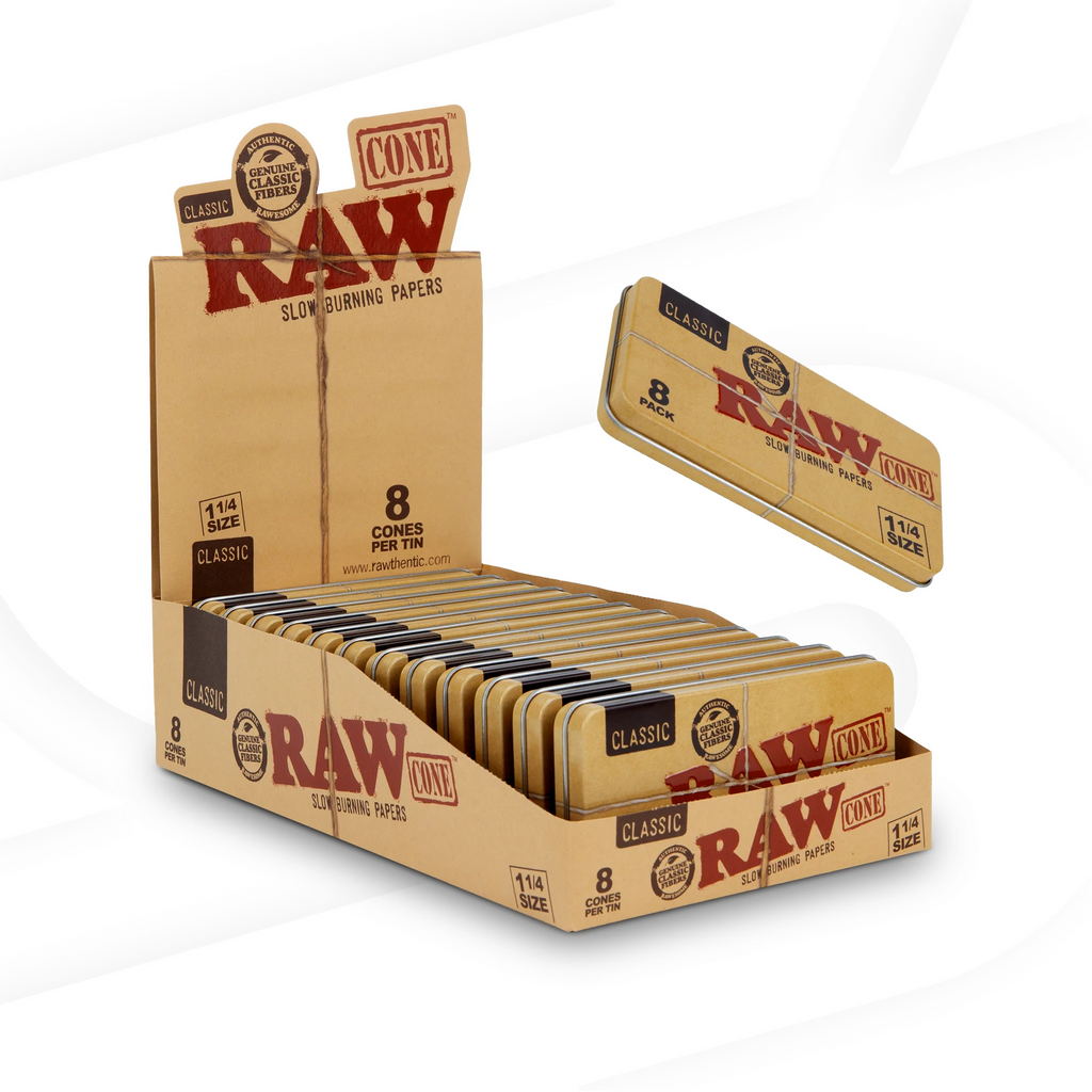 This durable, reusable RAW Classic 1 1/4 metal tin is designed for optimal storage of your RAW pre-rolled cones.