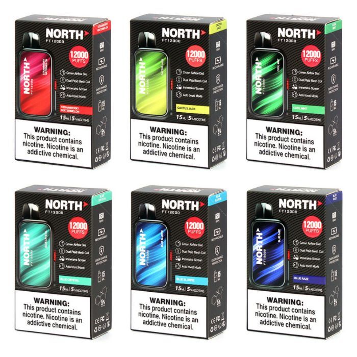 The North FT12000 is a top-notch disposable vape device. It’s prefilled with 15ml of 5% nicotine salt e-liquid, offering up to 12000 puffs. It’s powered by a 650mAh rechargeable battery for long-lasting use. It features a Crown Airflow Dial with three modes: Discrete, Full Flavor, and Auto Boost, for a customizable vaping experience. The Dual Plaid Mesh Coil enhances flavor and vapor production, while the Immersive Screen adds to the visual appeal. It offers 17 bold flavors, catering to diverse taste preferences. It also has Overcharge Protection for enhanced safety and longevity.